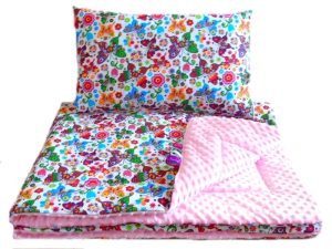 Komplety pościeli z wypełnieniem dla najmłodszych. Przeznaczone do wózków, gondoli, koszy mojżesza, kokonów, czy kołyski. Wykonane z plushu Minky i bawełny. Kołderka 55×75 cm i podusia. Dwustronna.